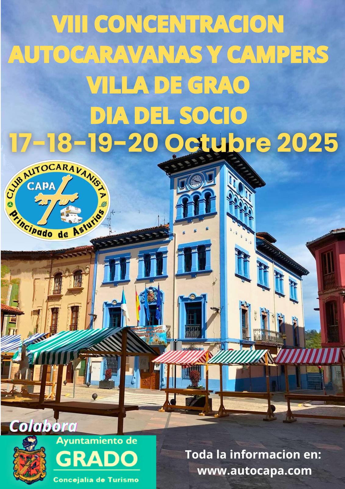 Los próximos 17, 18, 19 Y 20 de octubre, celebraremos de nuevo la Concentración de Autocaravanas y Campers Villa de Grado, en esta su octava edición, y nuestro día del Socio con la tradicional fabada, que degustaremos el sábado 18, en el conocido por todos, recinto ferial de la villa moscona (Mercado de Ganados).