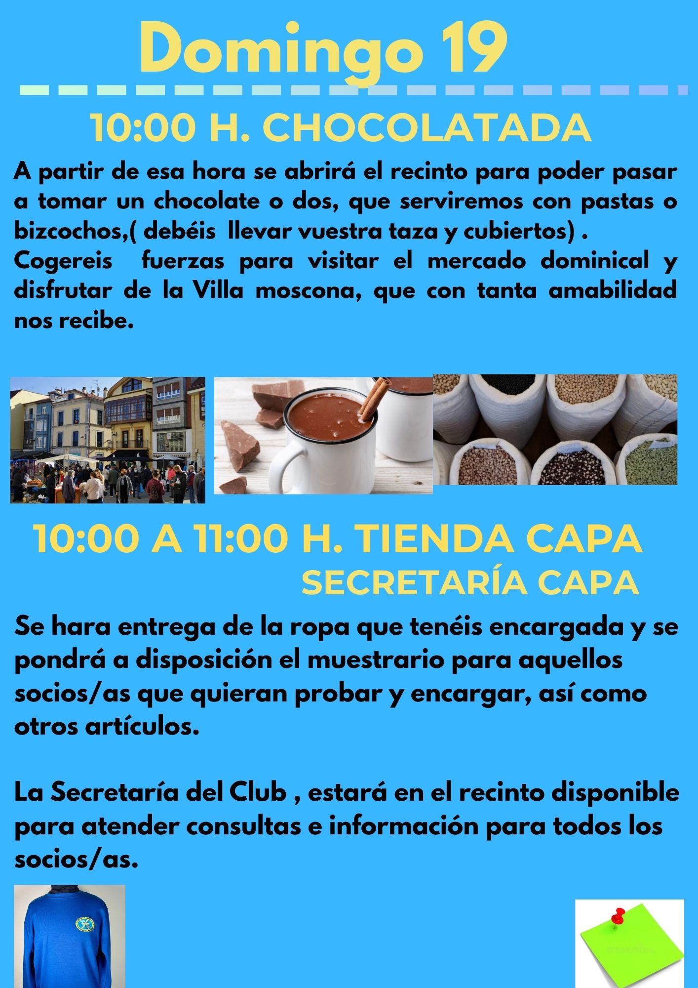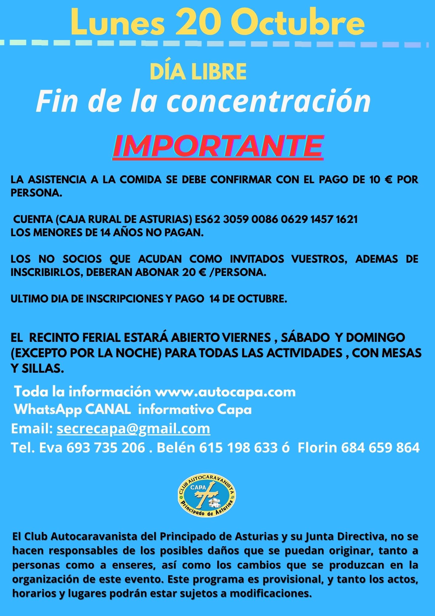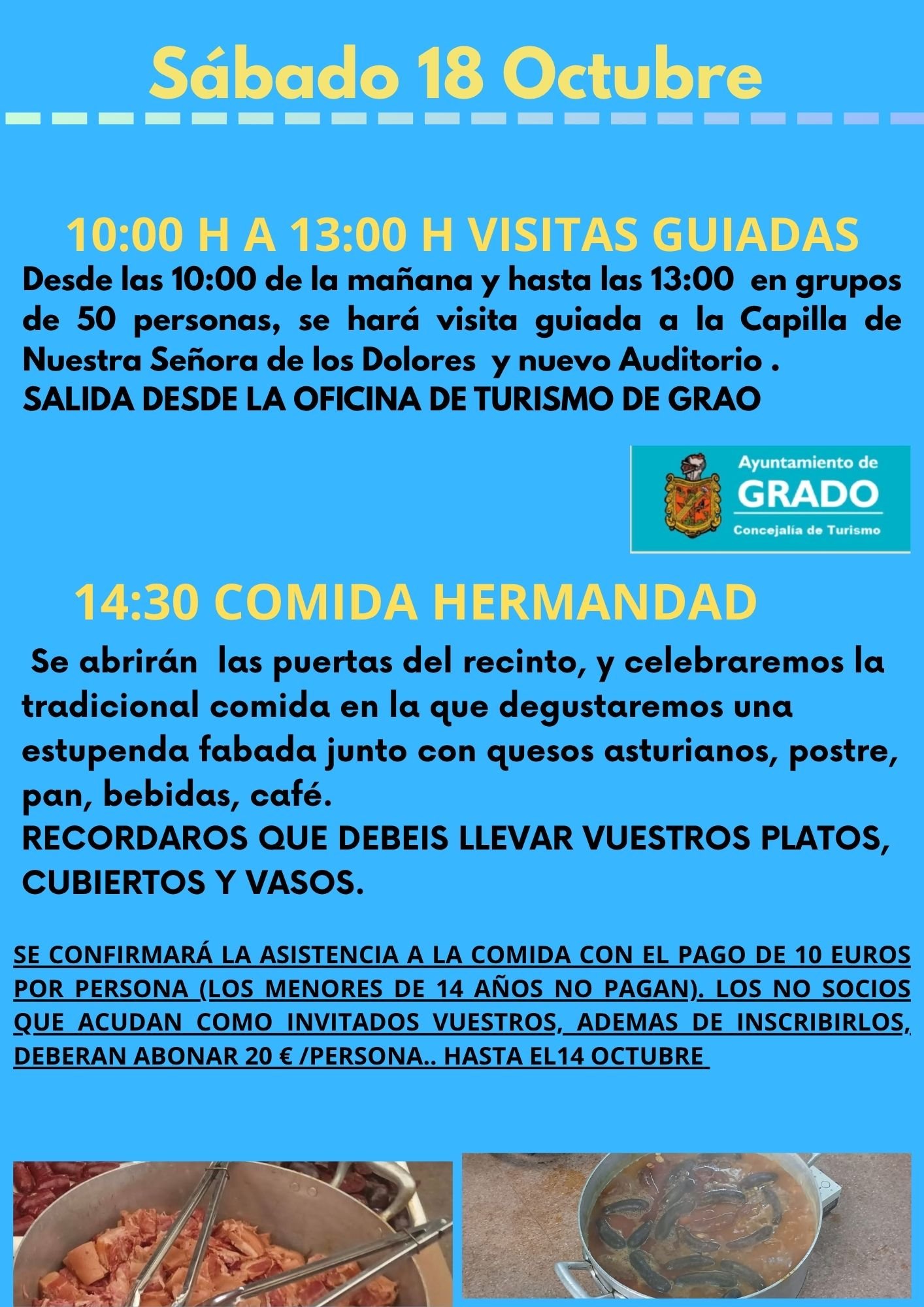 RECORDAROS QUE PARA LA COMIDA DEL DIA 18 DEBEREIS LLEVAR VUESTROS PLATOS, CUBIERTOS Y VASOS. SE CONFIRMARÁ LA ASISTENCIA A LA COMIDA CON EL PAGO DE 10 EUROS POR PERSONA (los menores de 14 años no pagan). LOS NO SOCIOS QUE ACUDAN COMO INVITADOS VUESTROS, ADEMAS DE INSCRIBIRLOS, DEBERAN ABONAR 20 € /persona.